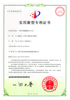 礦用LED直燈專利證書