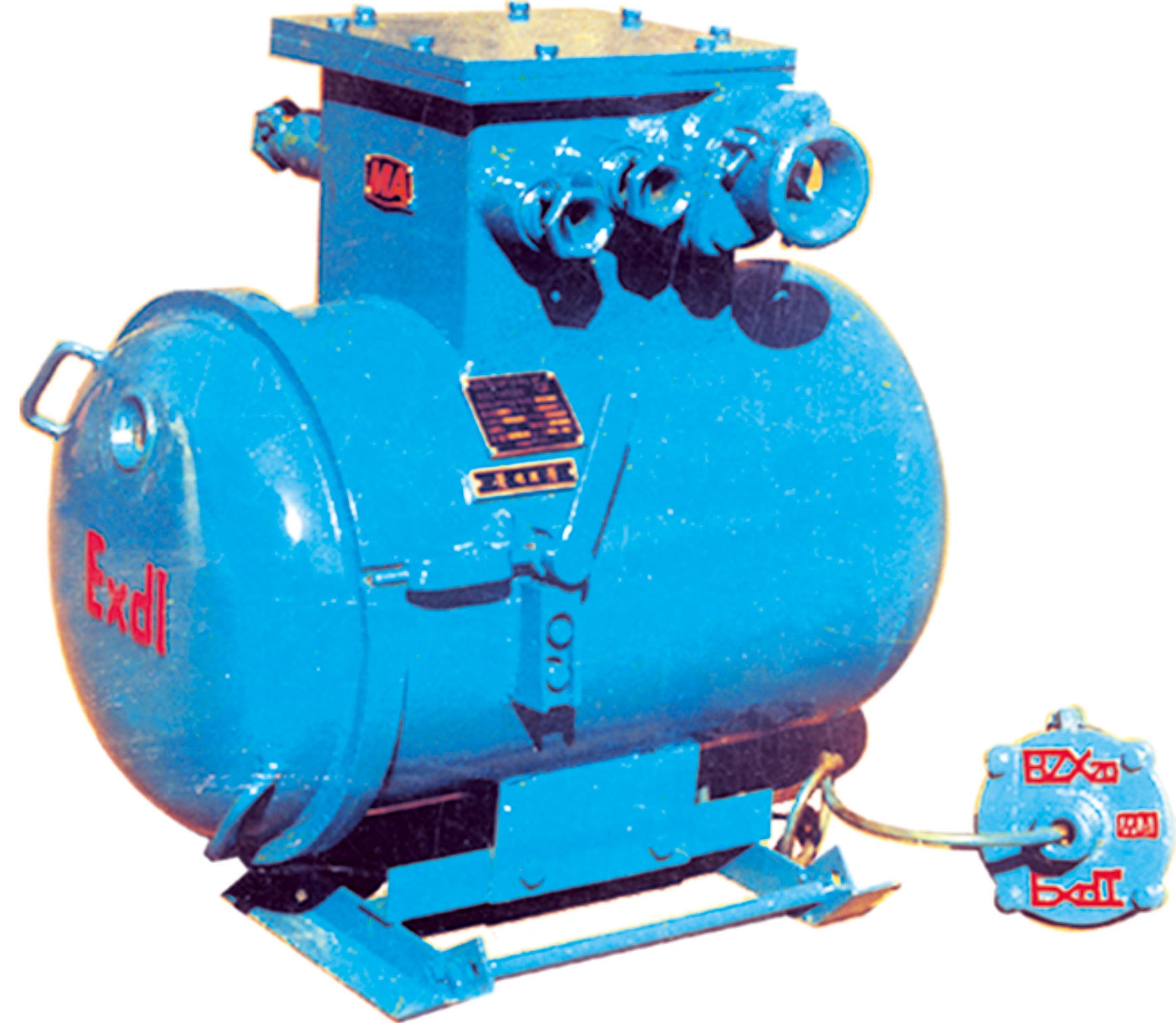 本綜合裝置主要由隔爆外殼、干式變壓器、機芯三部分組成。隔爆外殼為圓筒型,具有凸出的底和蓋,殼蓋與殼身采用轉(zhuǎn)蓋止口結(jié)構(gòu), 開啟方便。外殼上部有一接線箱作為引進和引出的電纜用.外殼右側(cè)裝有操作隔離開關(guān)的手柄和檢查短路、漏電保護的試驗按鈕,并有可靠的機械聯(lián)鎖裝置,殼蓋上方有觀察窗,可以從外面觀察指示燈狀態(tài)。機芯主要由控制變壓器、交流接觸器、直流繼電器以及電子插件等組成。干式變壓器與機芯的聯(lián)結(jié)采用端子板,檢修時機芯可獨立拿出。