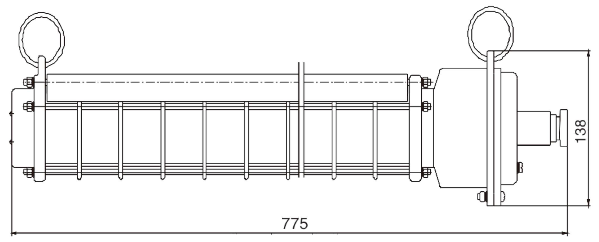 LED燈由左、右蓋及電源、光源、防爆玻璃罩、金屬防護(hù)罩等部分組成。左蓋上設(shè)有銘牌。殼體內(nèi)裝有恒壓恒流源、接線(xiàn)座,右蓋設(shè)有電纜引入裝置和外接地螺釘。防爆玻璃罩與左蓋、右殼體間由密封墊密封;光源連同散熱器裝在防爆波里罩內(nèi)。光源腔與接線(xiàn)腔,燈具內(nèi)腔與外界均有符合規(guī)定的防爆接合面防爆。